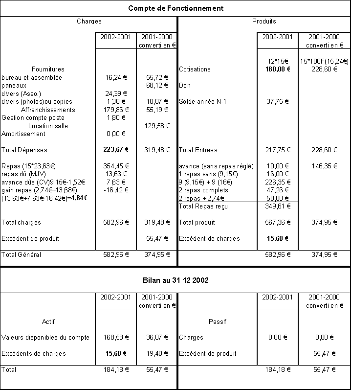 - Il étudie les comptes de l'année 2001-2002, les documents sont présentés dans le dossier d'accueil, selon l'établissement des comptes au 15 09 2002, jour de la réunion. Les années se chevauchent, elles ne correspondent pas à l’année civile car cela à débuter en mai 2000.