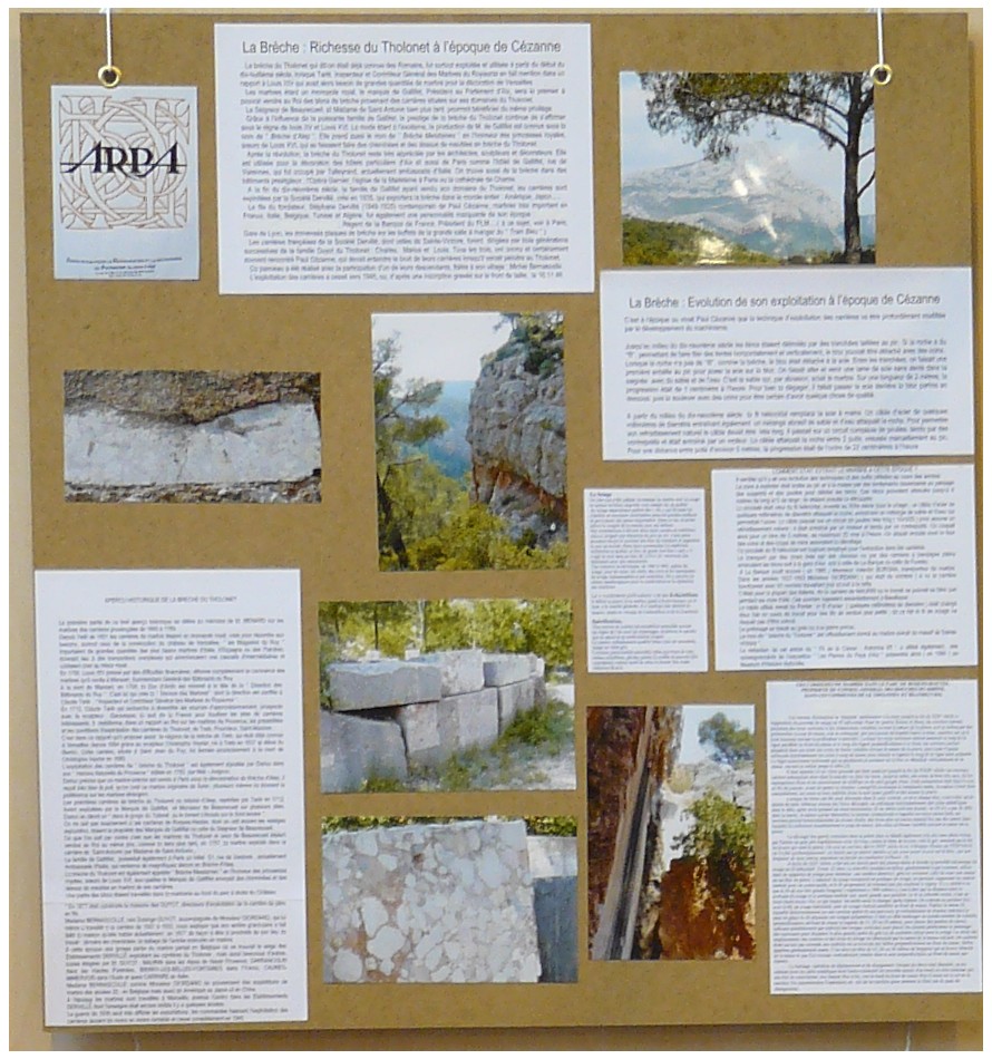 La Brèche, dans le Tholonet (époque de Cézanne) déjà connue des romains, fut surtout exploitée et utilisée à partir du début du XVIII iéme siécle, lorsque Tarlé, inspecteur et contrôleur général des Marbres de Royaume en fait mention dans un rapport à Louis XIV qui avait alors besoin de grandes quantité de marbre pour la décoration de Versailles.