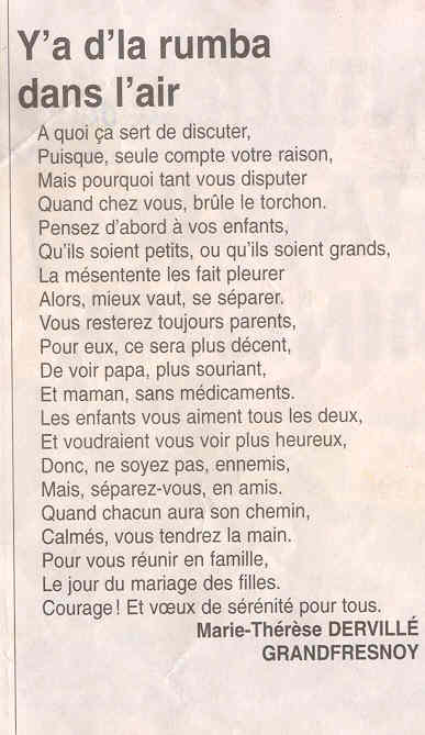 A quoi ça sert de discuter, Puisque, seule compte votre raison, Mais pourquoi tant vous disputer Quand chez vous, brûle le torchon. Pensez d'abord à vos enfants, Qu'ils soient petits, ou qu'ils soient grands, La mésentente les fait pleurer Alors, mieux vaut, se séparer. Vous resterez toujours parents, Pour eux, ce sera plus décent, De voir papa, plus souriant, Et maman, sans médicaments. Les enfants vous aiment tous les deux, Et voudraient vous voir plus heureux, Donc ne soyez pas, ennemis, Mais, séparez-vous, en amis. Quand chacun aura son chemin, Calmés, vous tendrez la main. Pour vous réunir en famillle, Le jour du mariage des filles. Courage ! Et voeux de sérénité pour tous. |